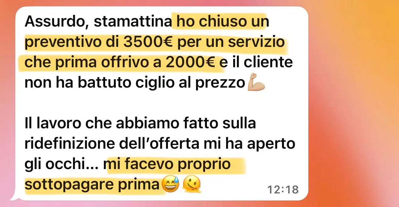 Grazie al Pricing Tracker rivedremo il tuo compenso desiderato e aggiusteremo i tuoi prezzi + aggiungeremo il pepe che manca alla tua offerta per renderla desiderabile da parte del tuo Cliente Ideale (=il fulcro di tutto il tuo business).