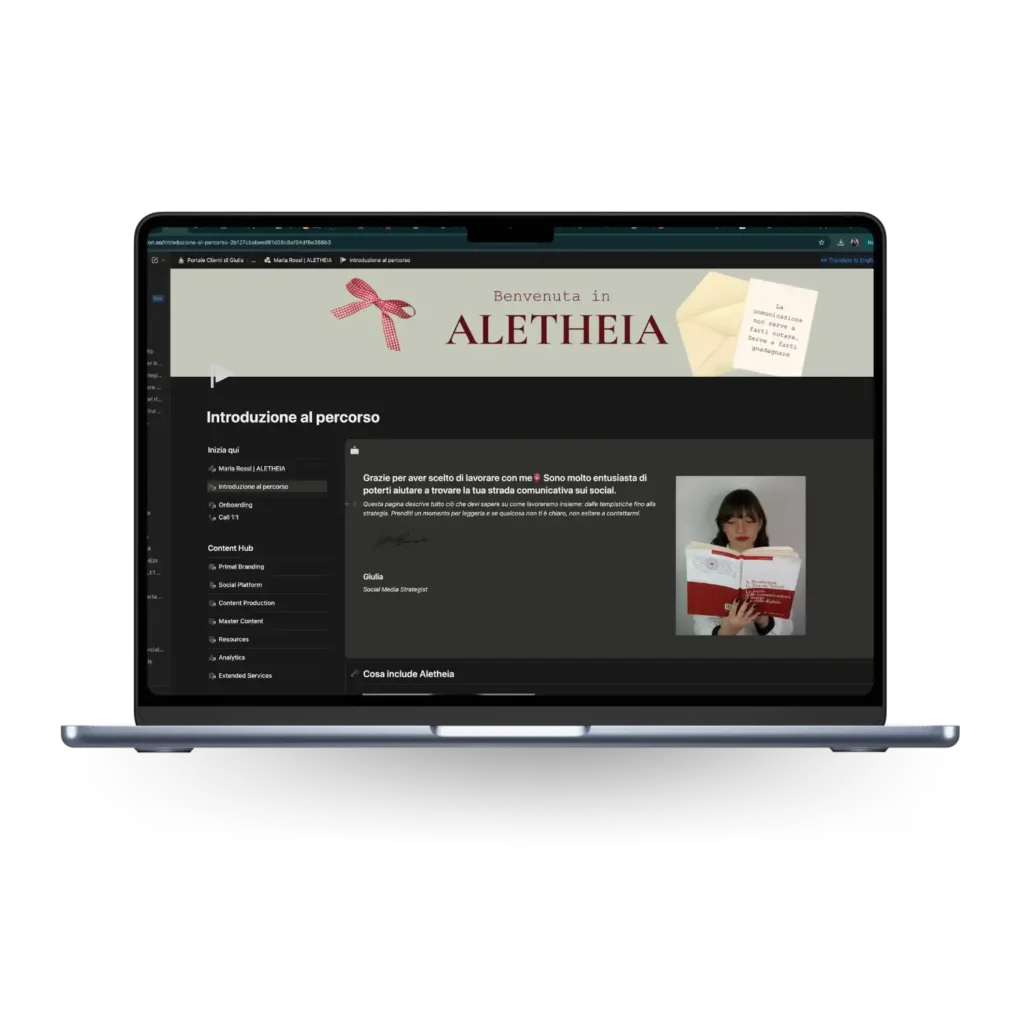 Con Aletheia non imparerai solo a creare contenuti efficaci, ma costruiremo un brand riconoscibile, il tuo. Un personal brand che parla davvero di te, dei tuoi valori, della tua filosofia di lavoro, e che ti permette di vendere i tuoi servizi con consapevolezza e sicurezza.